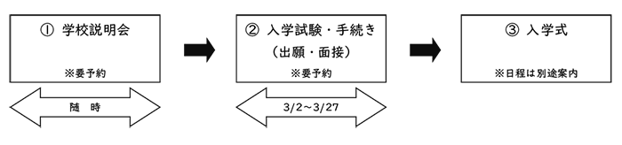 ※ 期間内であっても、定員が充足次第終了します。入学試験日 出願時 入学試験の内容 個人面接 結果発表 入学試験終了後(即日) - 入学までの流れ
